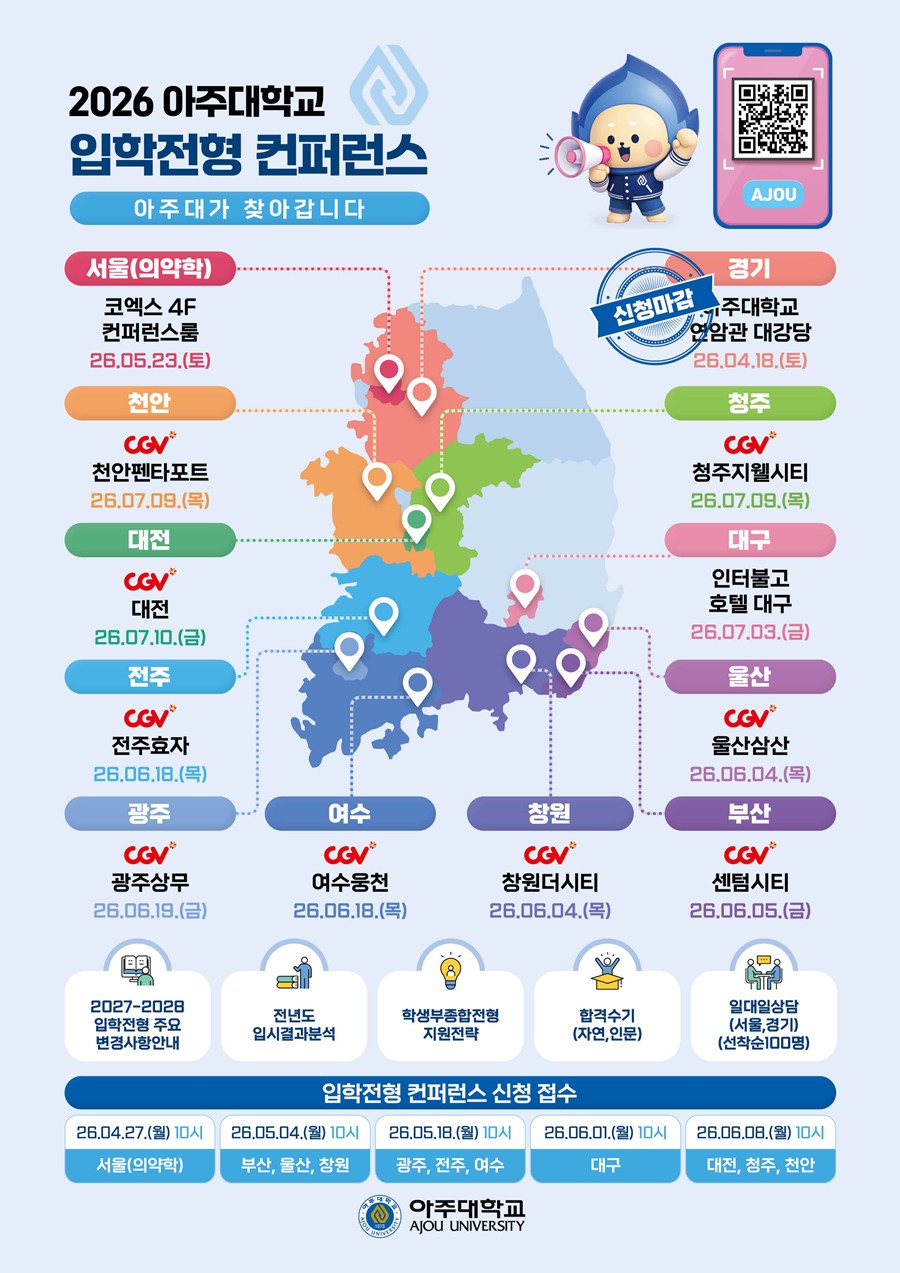 이번 컨퍼런스는 아주대 진학을 희망하는 수험생과 학부모, 진로 지도 교사들에게 정확한 정보를 제공해 입시 혼란을 줄이고 대학의 브랜드 이미지를 높이기 위해 기획됐다. 지난해 서울과 부산 등 6개 지역에서 열렸던 행사는 올해 서울, 부산, 대구, 광주, 대전, 울산, 천안, 청주, 전주, 여수, 창원 등 전국 12곳으로 확대됐다. 다만, 코엑스에서 열리는 입학전형 컨퍼런스는 의약학 계열에 특화해 진행한다.
