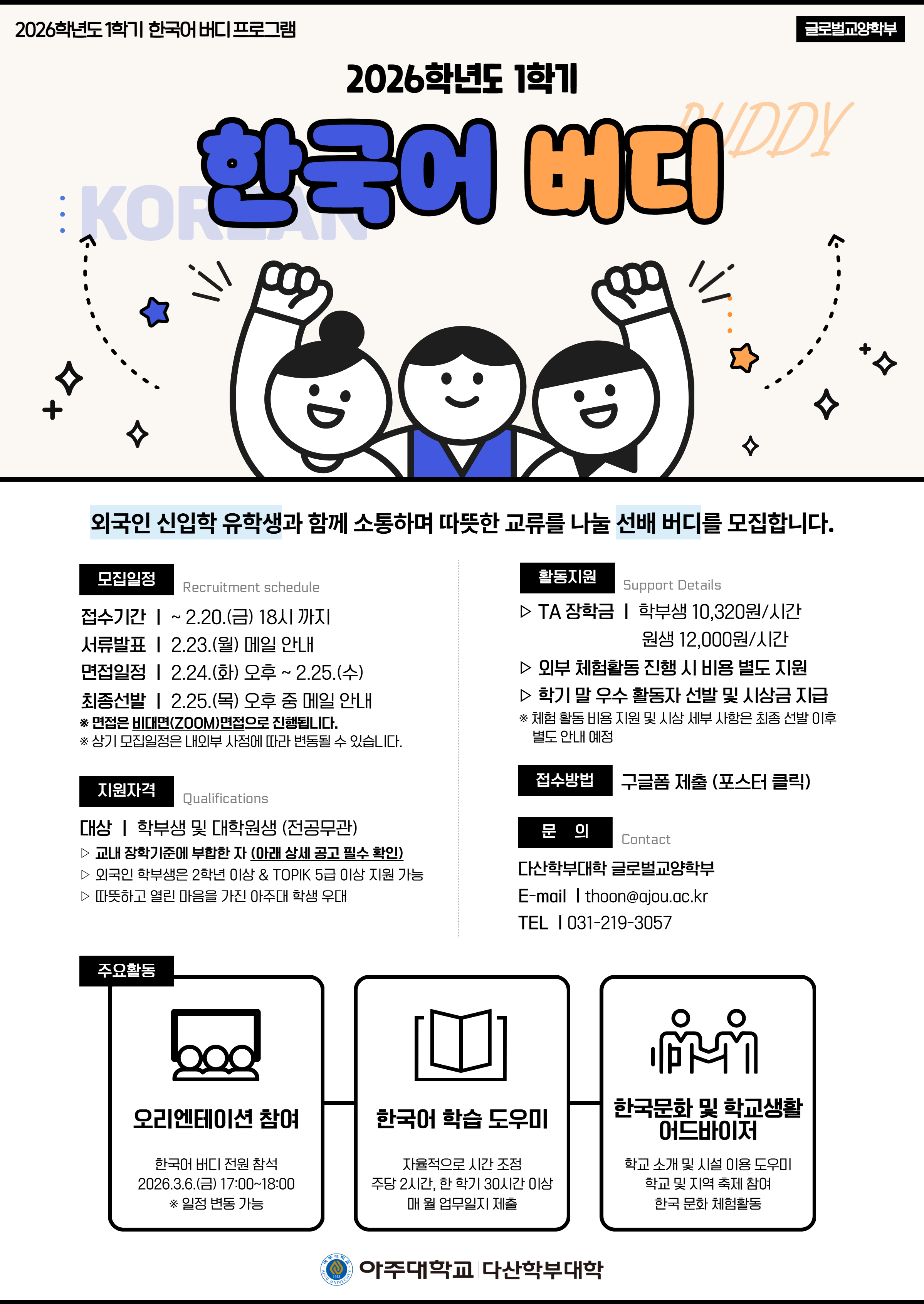 문의: 글로벌교양학부(thoon@ajou.ac.kr 또는 ☎ 031-219-3057)